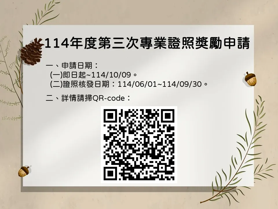 「114年度第三次學生申請專業證照獎勵」辦理事宜
